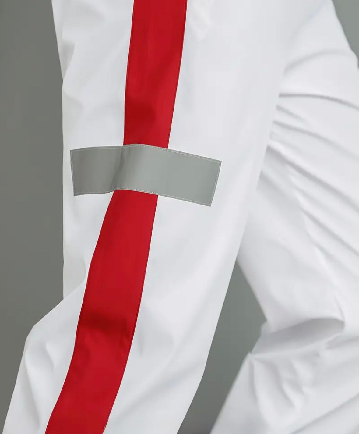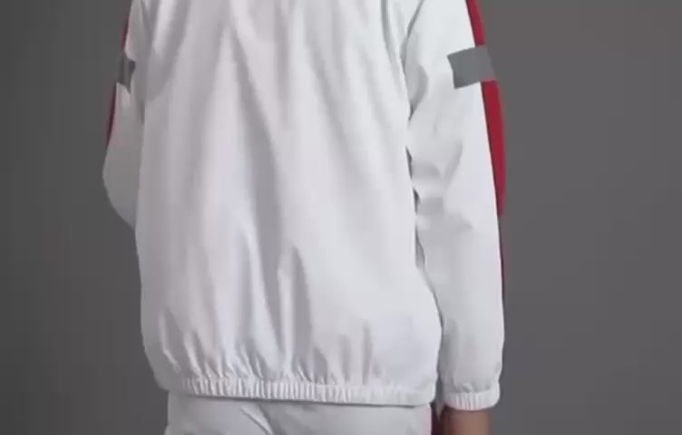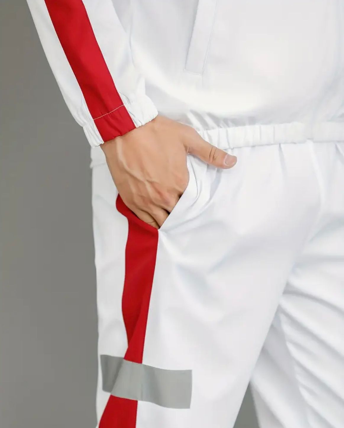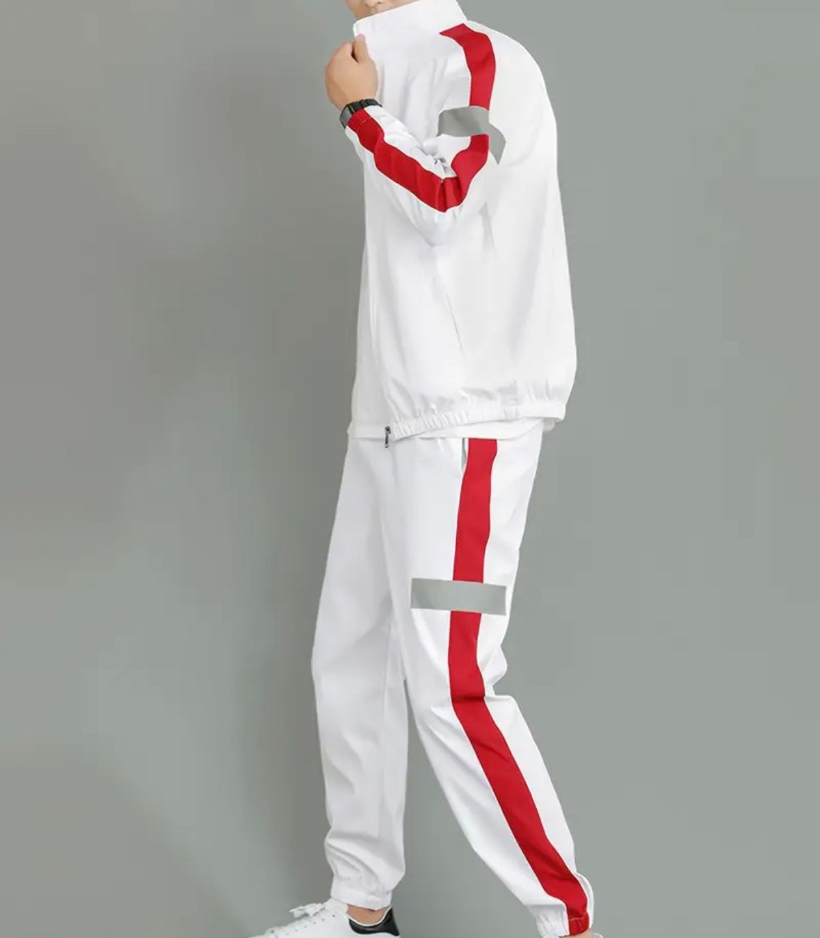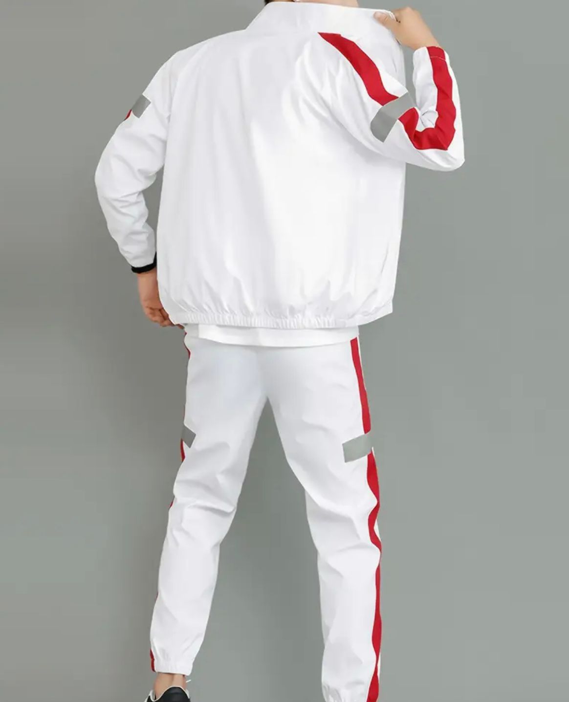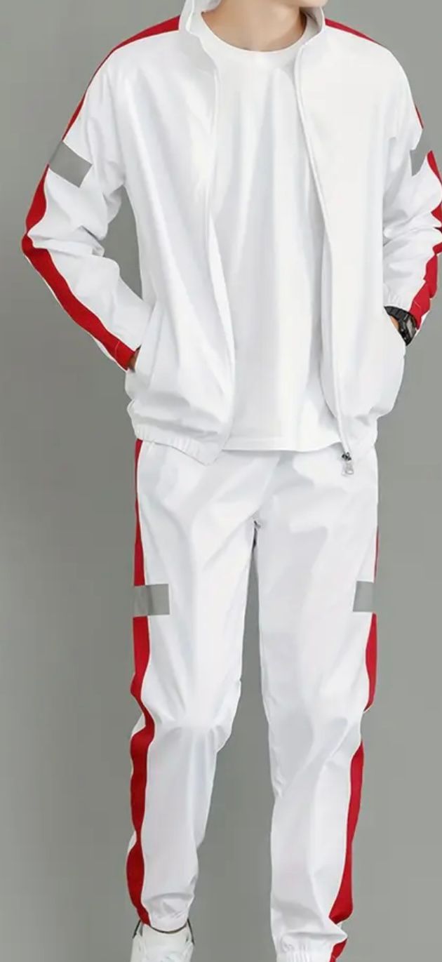 El chándal blanco con franjas rojas y detalles reflectantes es ideal para quienes buscan comodidad y estilo. Su diseño moderno te hará destacar, ya sea que vayas a entrenar o simplemente a relajarte.